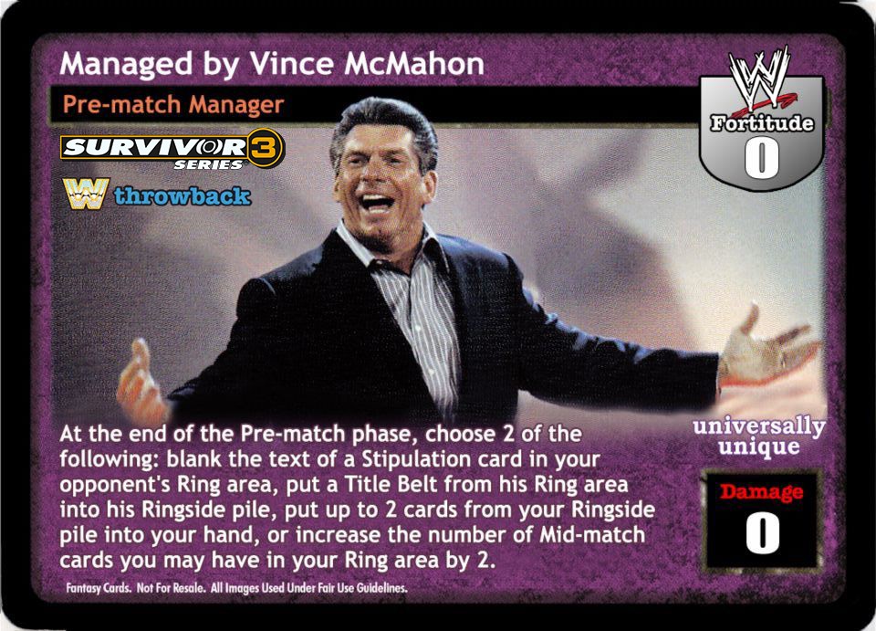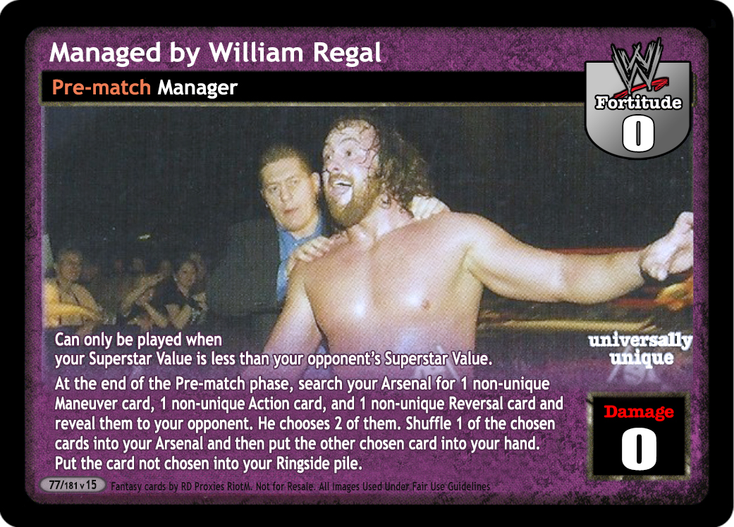 Can only be played when your Superstar Value is less than your opponent's Superstar Value. At the end of the Pre-match phase, search your Arsenal for 1 non-unique Maneuver card, 1 non-unique Action card, and 1 non-unique Reversal card and reveal them to your opponent. He chooses 2 of them. Shuffle 1 of the chosen cards into your Arsenal and then put the other chosen card into your hand. Put the card not chosen into your Ringside pile.