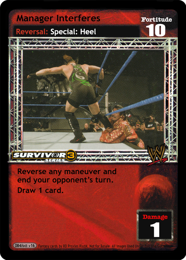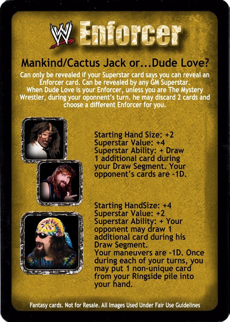 Can only be revealed if your Superstar card says you can reveal an Enforcer card. Can be revealed by any GM Superstar. When Dude Love is your Enforcer, unless you are The Mystery Wrestler, during your opponent's turn, he may discard 2 cards and choose a different Enforcer for you. - Starting Hand Size: +2 Superstar Value: +4 Superstar Ability: + Draw 1 additional card during your Draw Segment. Your opponent's cards are -1D. - Starting Hand Size: +4 Superstar Value: +2 Superstar Ability: + Your opponent may draw 1 additional card during his Draw Segment. Your maneuvers are -1D. Once during each of your turns, you may put 1 non-unique card from your Ringside pile into your hand.