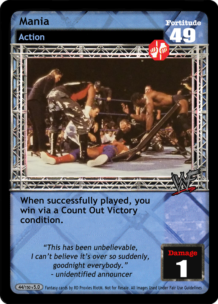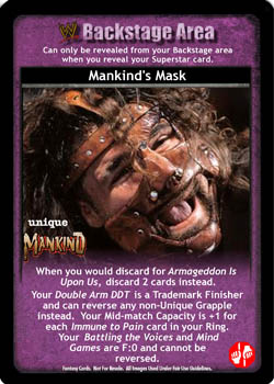 When you would discard for Armageddon Is Upon Us, discard 2 cards instead. Your Double Arm DDT is a Trademark Finisher and can reverse any non-Unique Grapple instead. Your Mid-match Capacity is +1 for each Immune to Pain card in your Ring. Your Battling the Voices and Mind Games are F:0 and cannot be reversed.