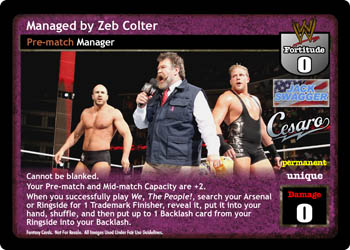 At the end of the Pre-match phase, choose 2 of the following: blank the text of a Stipulation card in your opponent's Ring area, put a Title Belt from his Ring area into his Ringside pile, put up to 2 cards from your Ringside pile into your hand, or increase the number of Mid-match cards you may have in your Ring area by 2.