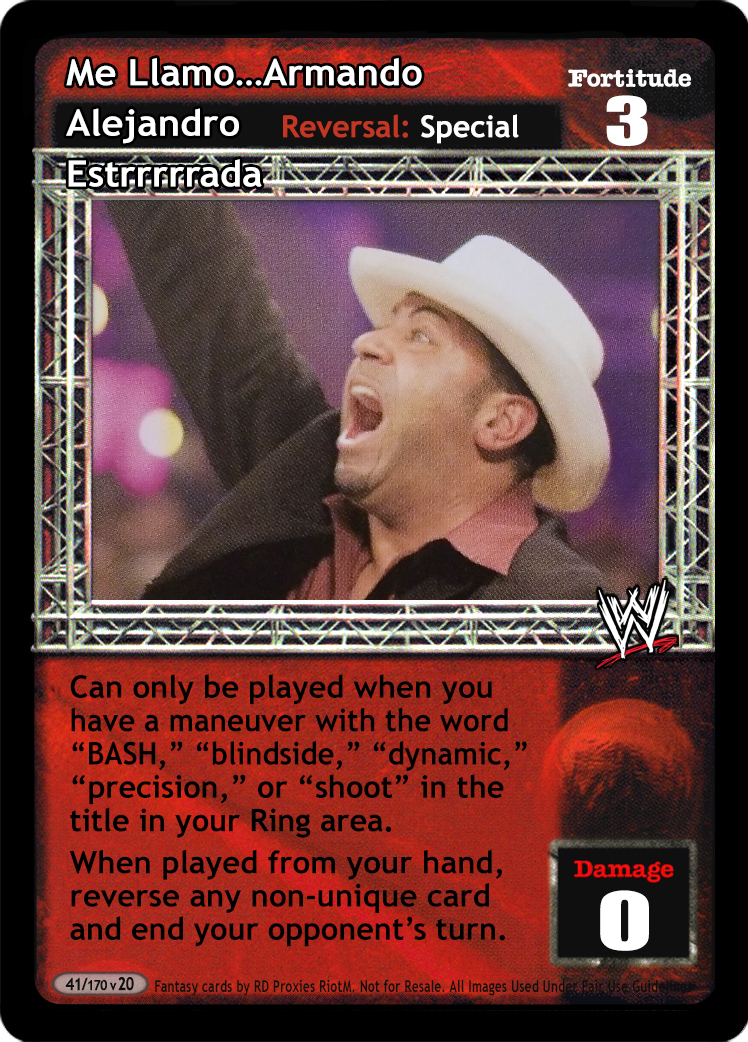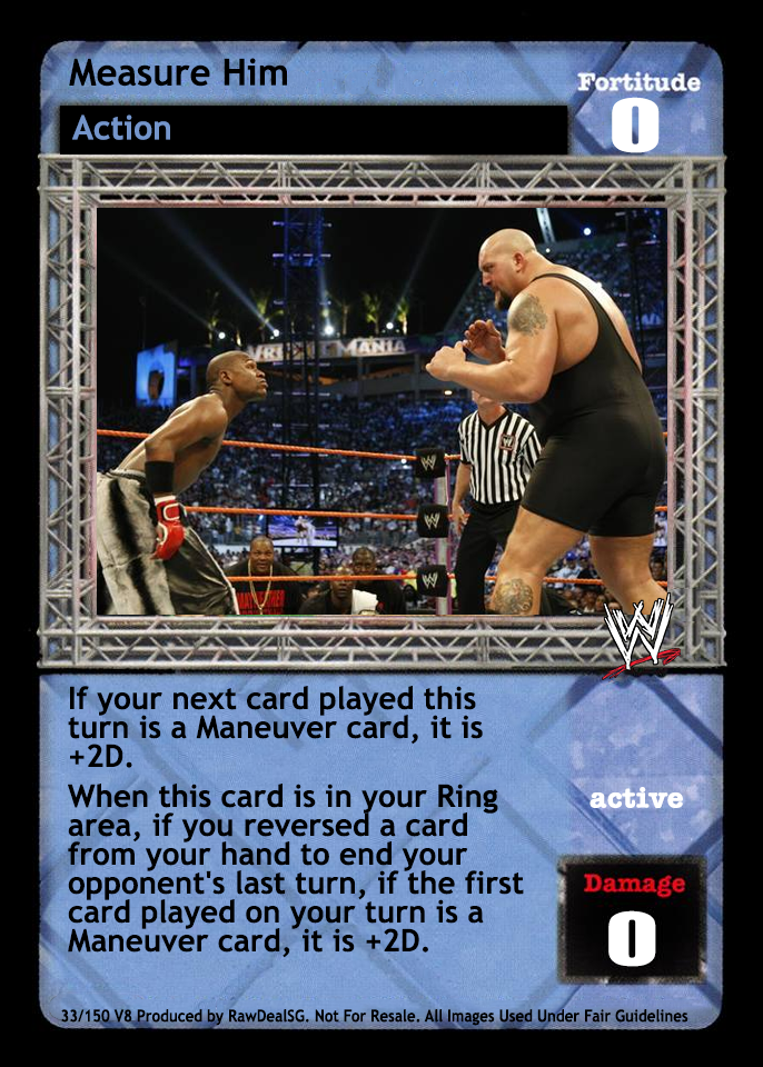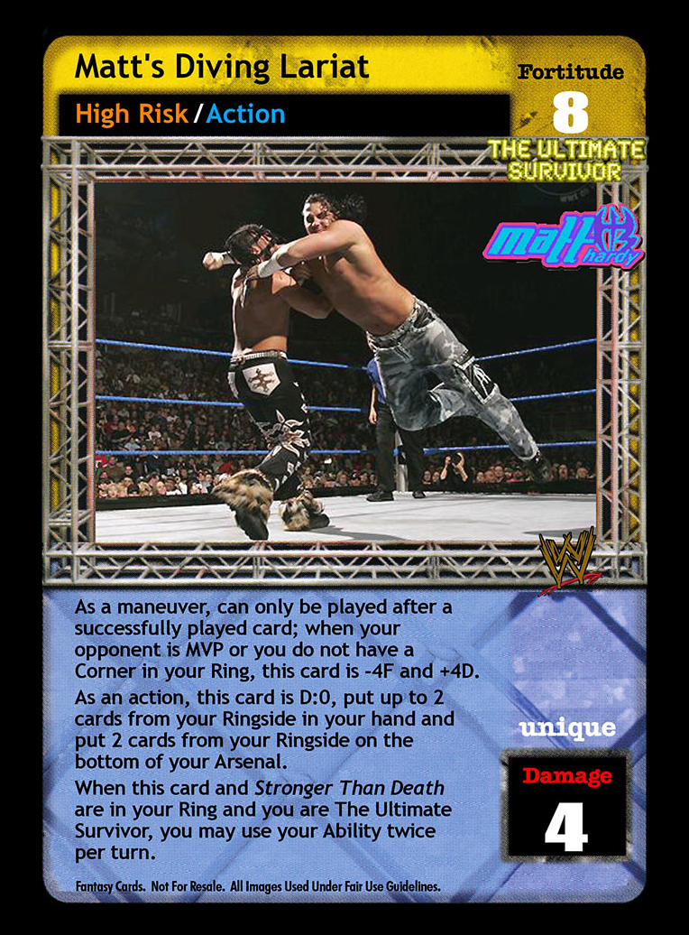 As a maneuver, can only be played after a successfully played card; when your opponent is MVP or you do not have a Corner card in your Ring, this card is -4F and +4D. As an action, this card is D:0, put up to 2 cards from your Ringside in your hand and put 2 cards from your Ringside on the bottom of your Arsenal. When this card and Stronger Than Death are in your Ring and you are The Ultimate Survivor, you may use your Ability twice per turn.