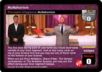 The first time during each of your turns you would draw cards outside of your Draw Segment, look at that many cards on the top of your Arsenal first and you may put any of those cards on the bottom of your Arsenal. When you are Vince McMahon, Shane O'Mac, The Genetic Jackhammer, or The McMahon Dynasty, you may use this effect during your Draw Segment instead.