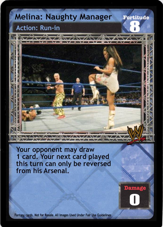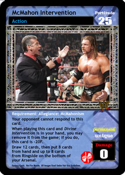 Requirement: Allegiance: McMahonism. Your opponent cannot respond to this card. When playing this card and Divine Intervention is in your hand, you may remove it from the game; if you do, this card is -20F. Draw 12 cards, then put 8 cards from hand and up to 8 cards from Ringside on the bottom of your Arsenal.