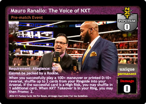 Requirement: Allegiance: NXT Cannot be packed by a Rookie. When you successfully play a 10D+ maneuver or printed D:10+ reversal, shuffle up to 2 cards from your Ringside into your Arsenal. If the successful card is a High Risk, you may shuffle in 1 additional card. When NXT Takeover is in your Ring, you may then Promo: 2.