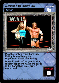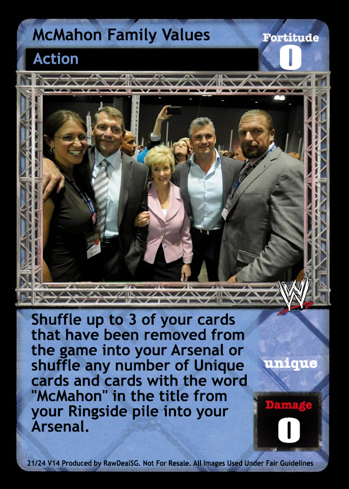 Shuffle up to 3 of your cards that have been removed from the game into your Arsenal or shuffle any number of Unique cards and cards with the word "McMahon" in the title from your Ringside pile into your Arsenal.