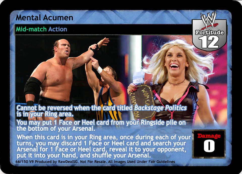 Cannot be reversed when the card titled Backstage Politics is in your Ring area. You may put 1 Face or Heel card from your Ringside pile on the bottom of your Arsenal. When this card is in your Ring area, once during each of your turns, you may discard 1 Face or Heel card and search your Arsenal for 1 Face or Heel card, reveal it to your opponent, put it into your hand, and shuffle your Arsenal.