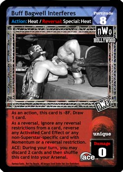 As an action, this card is -8F. Draw 1 card. As a reversal, ignore any reversal restrictions from a card, reverse any Activated Card Effect or any non-Superstar-specific card with Momentum or a reversal restriction. ACE: During your turn, you may discard 2 cards and then shuffle this card into your Arsenal.