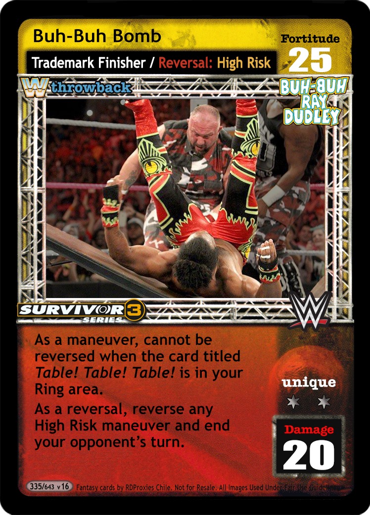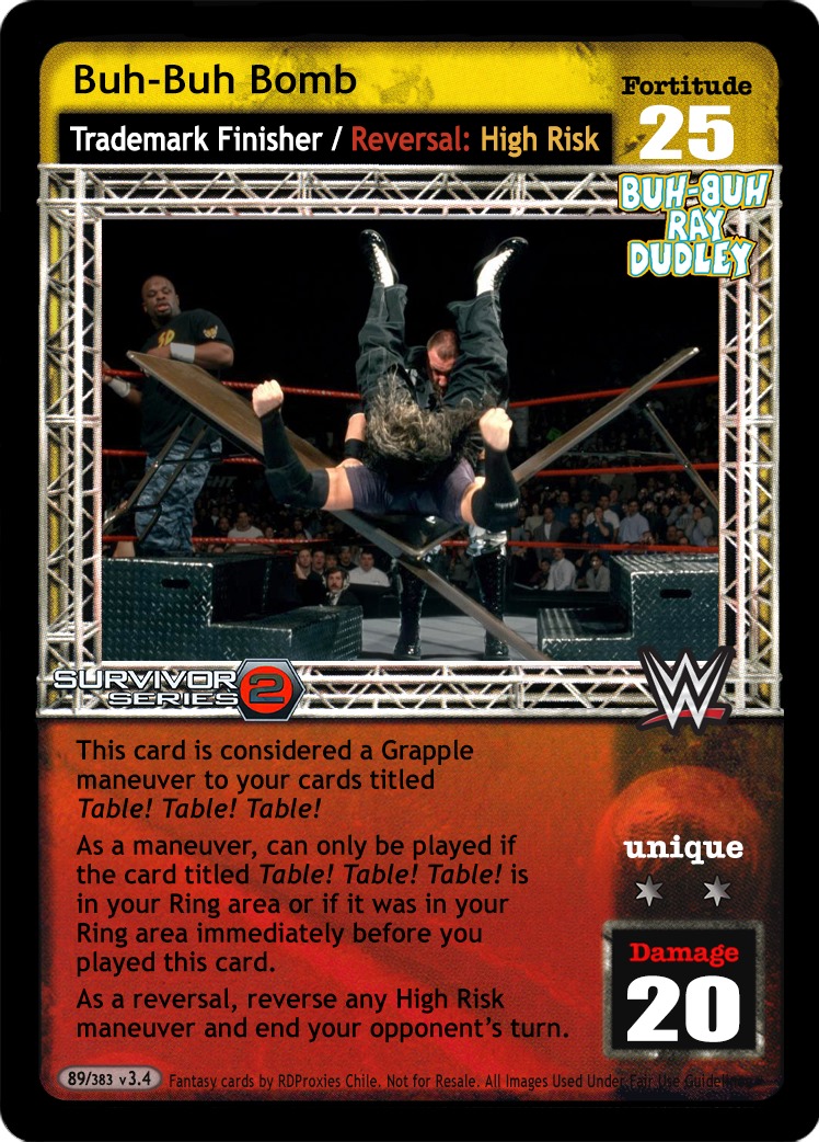 This card is considered a Grapple maneuver to your cards titled Table! Table! Table! As a maneuver, can only be played if the card titled Table! Table! Table! is in your Ring area or if it was in your Ring area immediately before you played this card. As a reversal, reverse any High Risk maneuver and end your opponent's turn.