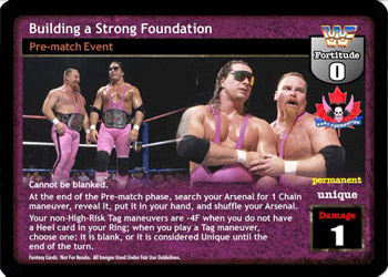 Cannot be blanked. At the end of the Pre-match phase, search your Arsenal for 1 Chain maneuver, reveal it, put it in your hand, and shuffle your Arsenal. Your non-High-Risk Tag maneuvers are -4F when you do not have a Heel card in your Ring; when you play a Tag maneuver, choose one: it is blank, or it is considered Unique until the end of the turn.