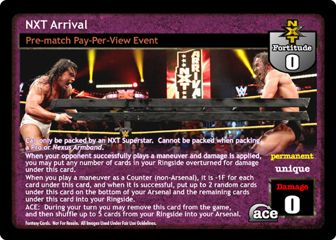Can only be packed by an NXT Superstar. Cannot be packed when packing a Pro or Nexus Armband. When your opponent successfully plays a maneuver and damage is applied, you may put any number of cards in your Ringside overturned for damage under this card. When you play a maneuver as a Counter (non-Arsenal), it is -1F for each card under this card, and when it is successful, put up to 2 random cards under this card on the bottom of your Arsenal and the remaining cards under this card into your Ringside. ACE: During your turn you may remove this card from the game, and then shuffle up to 5 cards from your Ringside into your Arsenal.