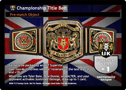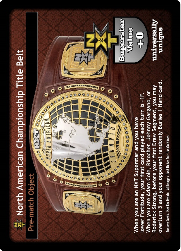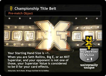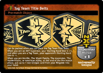 Can be packed when you can pack the Tag Team Title Belts. When you are an NXT Superstar, your Starting Hand Size is +1, and when you are a Tag Team, your opponent's Starting Hand Size is -1. When you are Neville, The Wyatt Family, The Ascension, The Vaudevillains, or American Alpha, at the end of the Pre-match phase, put up to 1 non-Unique card from your Ringside into your hand. Superstar Value +1