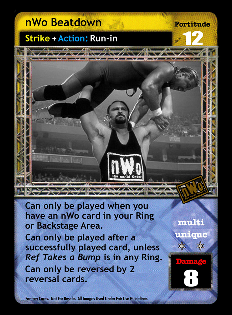Can only be played if there is an nWo card in your Ring or Backstage Area. Can only be played after a successfully played card, unless Ref Takes a Bump is in any Ring. Can only be reversed by 2 reversal cards.