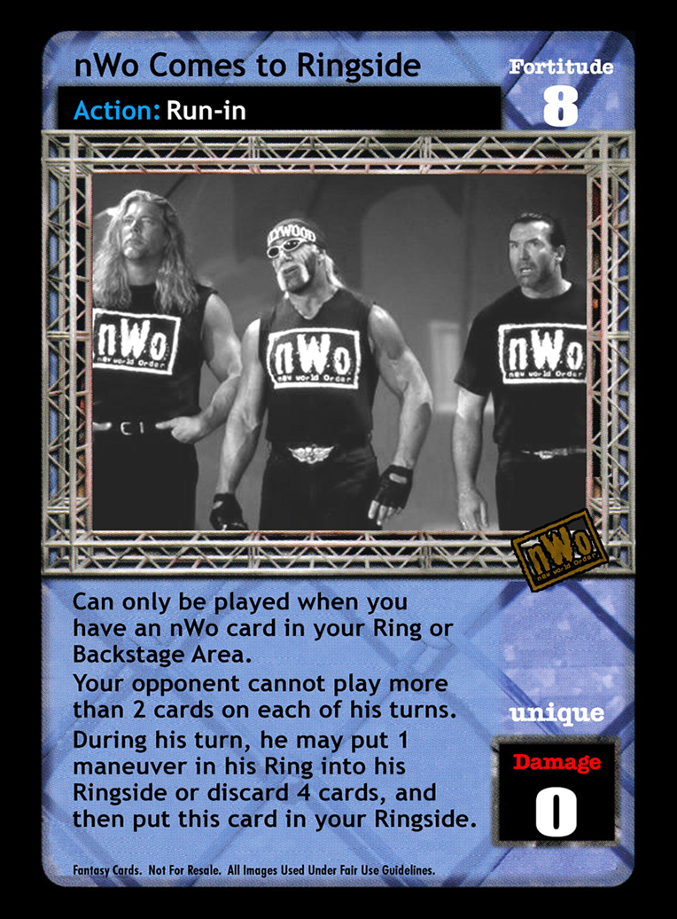 Can only be played if you have an nWo card in your Ring or Backstage area. Your opponent cannot play more than 2 cards on each of his turns. During his turn, he can put one maneuver in his Ring into his Ringside or discard 4 cards to put this card into your Ringside.