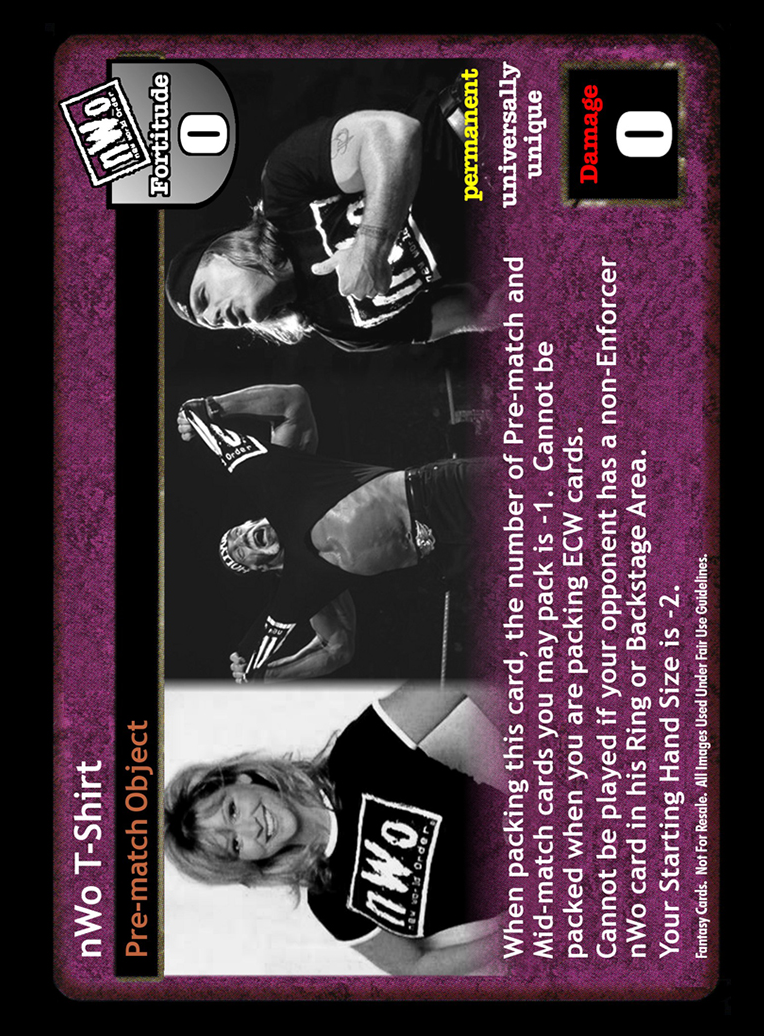 When packing this card, the number of Pre-match and Mid-match cards you may pack is -1. Cannot be packed when you are packing ECW cards. Cannot be played if your opponent has a non-Enforcer nWo card in his Ring or Backstage Area. Your Starting Hand Size is -2.
