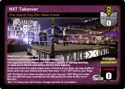 Requirement: Allegiance: NXT Cannot be packed by a Rookie. Your opponent cannot reduce your Pre-match Capacity, Starting Hand Size or make you discard cards before the first Draw Segment. At the end of the Pre-match phase when a Venue is in any Ring, you may shuffle up to # cards in your hand into your Arsenal and draw the same number +1 (# is the number of NXT cards in your Ring). ACE: During his turn when he plays a card, you may put 1 NXT card from your Ring under this card and then your reversals are not affected by his cards for the rest of the turn.