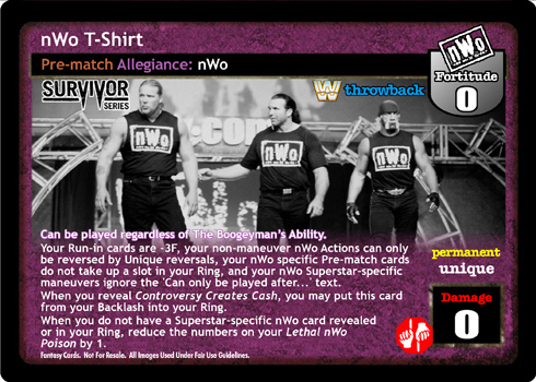 Can be played regardless of The Boogeyman's Ability. Your Run-in cards are -3F, your non-maneuver nWo Actions can only be reversed by Unique reversals, your nWo specific Pre-match cards do not take up a slot in your Ring, and your nWo Superstar-specific maneuvers ignore the 'Can only be played after...' text. When you are not packing a Superstar-specific nWo Pre-match card and you reveal, discard, play, or overturn an nWo card you may put this card from your Backlash into your Ring. When you have another Allegiance card in your Ring, put this card on top of that card and it is no longer considered to be in your Ring.