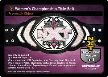Can only be packed by a Female Superstar. When you are an NXT Superstar, your Starting Hand Size is +1. When you are Paige, Charlotte, Sasha Banks, Bayley, or Asuka, this card is considered Superstar-specific and your opponent's Starting Hand Size is -1. Superstar Value +1