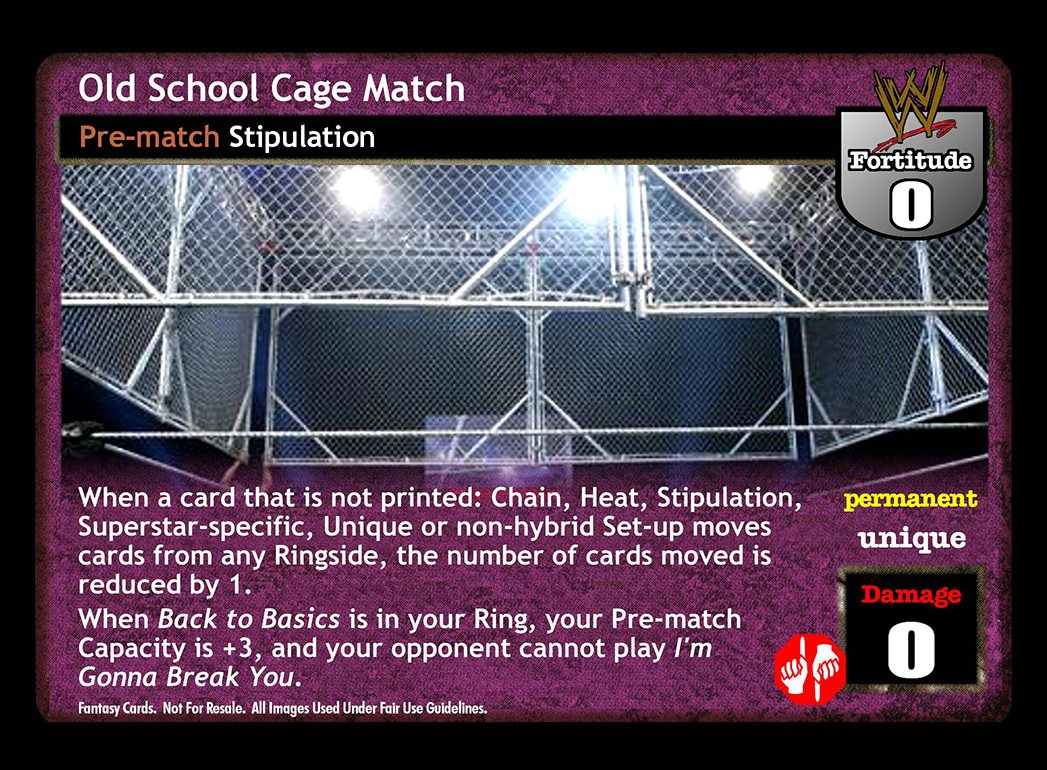 When a card that is not printed: Chain, Heat, Stipulation, Superstar-specific, or Unique moves cards from any Ringside, the number of cards moved is reduced by 1. When Back to Basics is in your Ring, your Pre-match Capacity is +3, and your opponent cannot play I'm Gonna Break You.