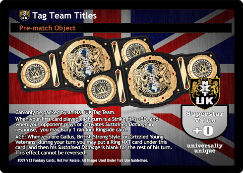 Can only be packed by an NXT UK Tag Team. When your first card played each turn is a Strike, it is +2D, and when your opponent plays or Activates Sustained Damage in response to it, you may Bury 1 random Ringside card. ACE: When you are Gallus, British Strong Style, or Grizzled Young Veterans, during your turn you may put a Ring NXT card under this card, and then his Sustained Damage is blank for the rest of his turn. This effect cannot be reversed. SSV: +0