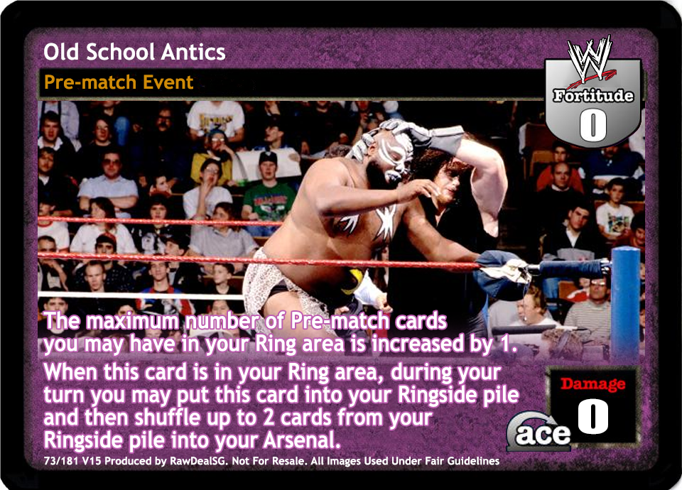 The maximum number of Pre-match cards you may have in your Ring area is increased by 1. When this card is in your Ring area, during your turn you may put this card into your Ringside pile and then shuffle up to 2 cards from your Ringside pile into your Arsenal.