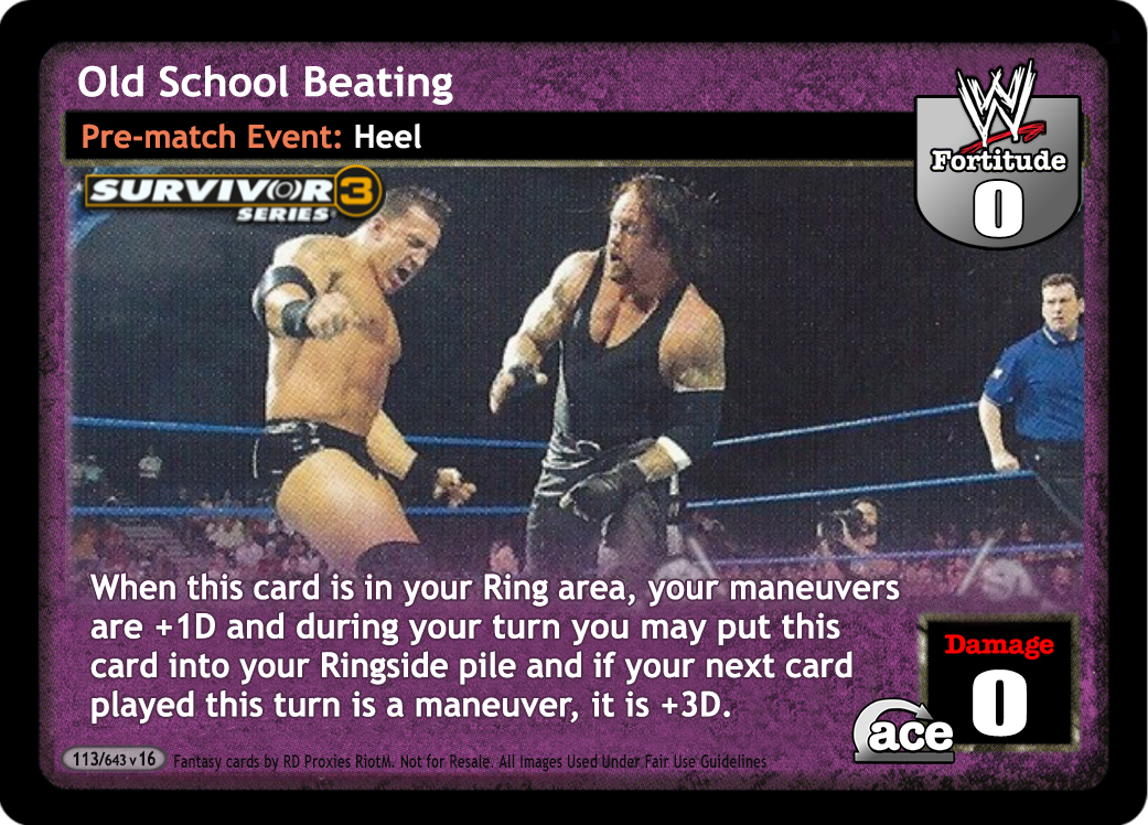 When this card is in your Ring area, your maneuvers are +1D and during your turn you may put this card into your Ringside pile and if your next card played this turn is a maneuver, it is +3D.