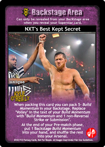 When packing this card you can pack 5- Build Momentum in your Backstage. Replace 'Volley' in the text of your Build Momentum with 'Build Momentum and 1 non-Reversal Strike or Submission'. At the end of your Pre-match phase, put 1 Backstage Build Momentum into your hand, and shuffle the rest into your Arsenal.