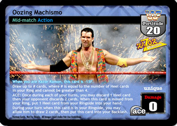 When you are Razor Ramon, this card is -15F. Draw up to # cards, where # is equal to the number of Heel cards in your Ring and cannot be greater than 4. ACE: Once during each of your turns, you may discard 1 Heel card and then your opponent discards 2 cards. When this card is moved from your Ring, put 1 Heel card from your Ringside into your hand. During your turn when this card is in your Ringside, you may allow him to draw 2 cards, then put this card into your Backlash.