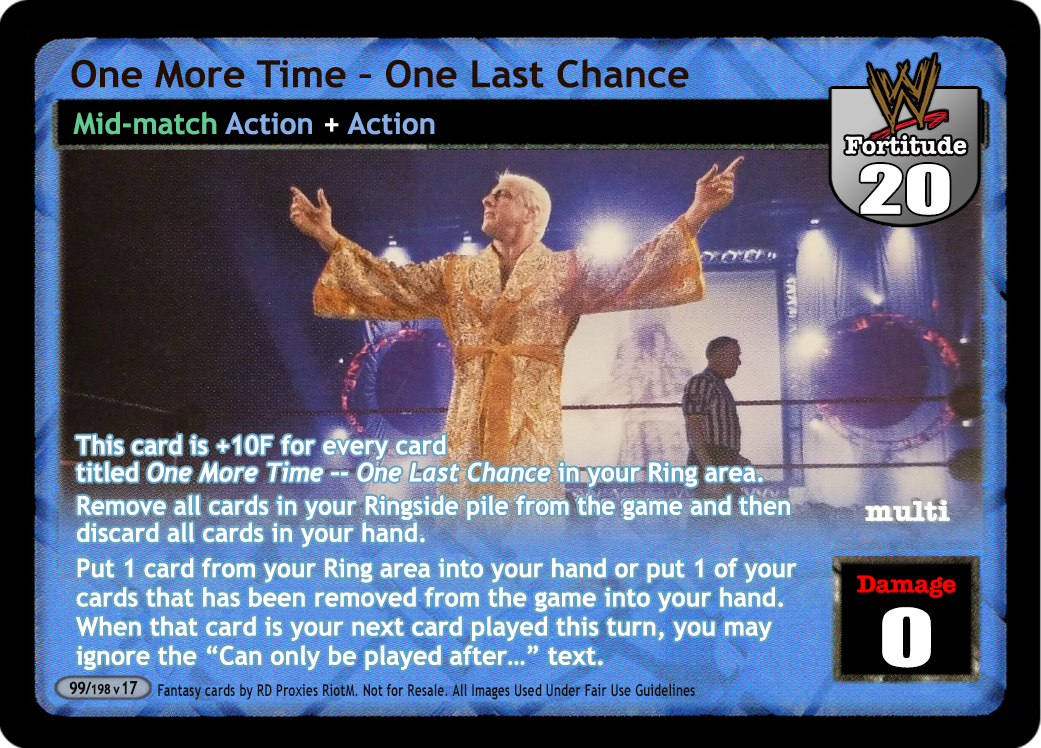 This card is +10F for every card titled One More Time - One Last Chance in your Ring area. Remove all cards in your Ringside pile from the game and then discard all cards in your hand. Put 1 card from your Ring area into your hand or put 1 of your cards that has been removed from the game into your hand. When that card is your next card played this turn, you may ignore the "Can only be played after..." text.