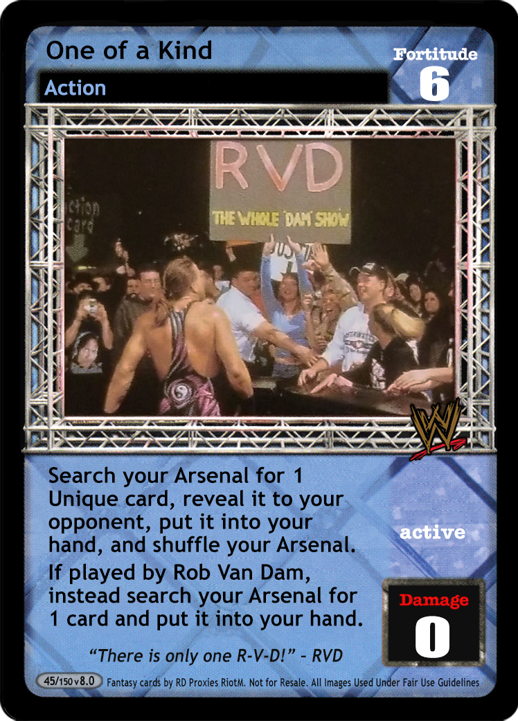 Search your Arsenal for 1 Unique card, reveal it to your opponent, put it into your hand, and shuffle your Arsenal. If played by Rob Van Dam, instead search your Arsenal for 1 card and put it into your hand.