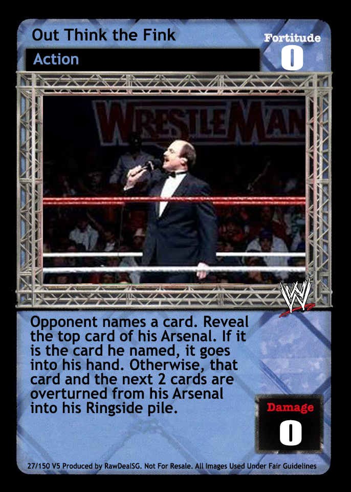 Opponent names a card. Reveal the top card of his Arsenal. If it is the card he named, it goes into his hand. Otherwise, that card and the next 2 cards are overturned from his Arsenal into his Ringside pile.