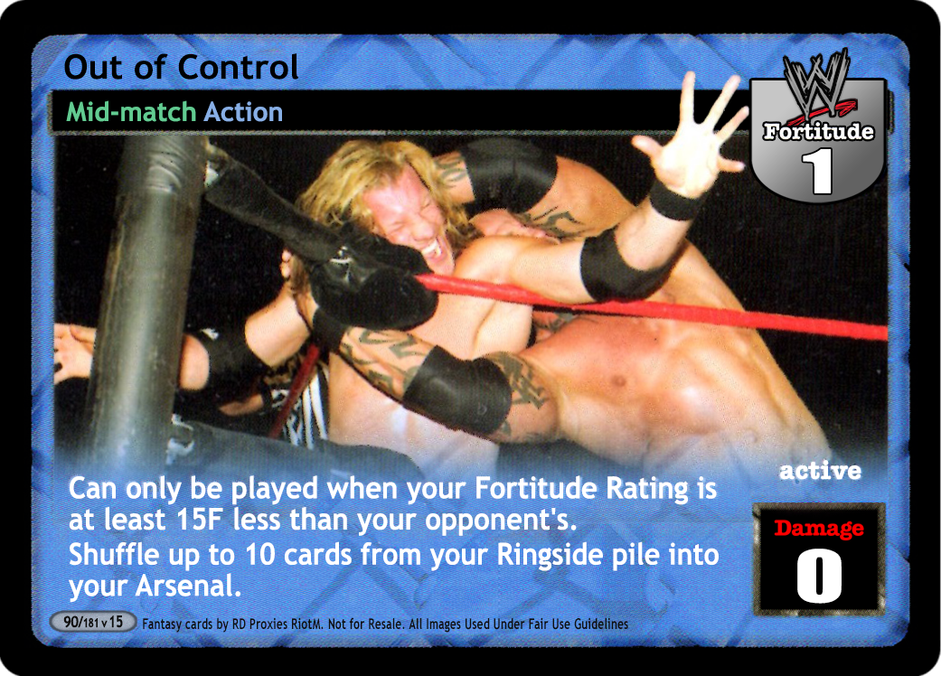 Can only be played when your Fortitude Rating is at least 15F less than your opponent's. Shuffle up to 10 cards from your Ringside pile into your Arsenal.