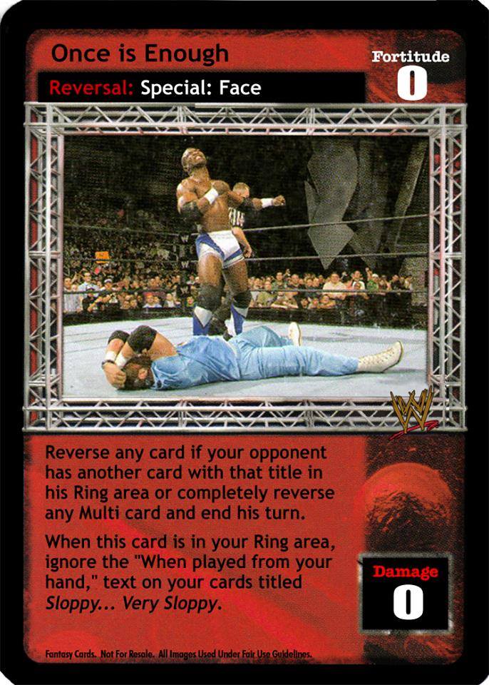 Reverse any card if your opponent has another card with that title in his Ring area or completely reverse any Multi card and end his turn. When this card is in your Ring area, ignore the "When played from your hand," text on your cards titled Sloppy... Very Sloppy.