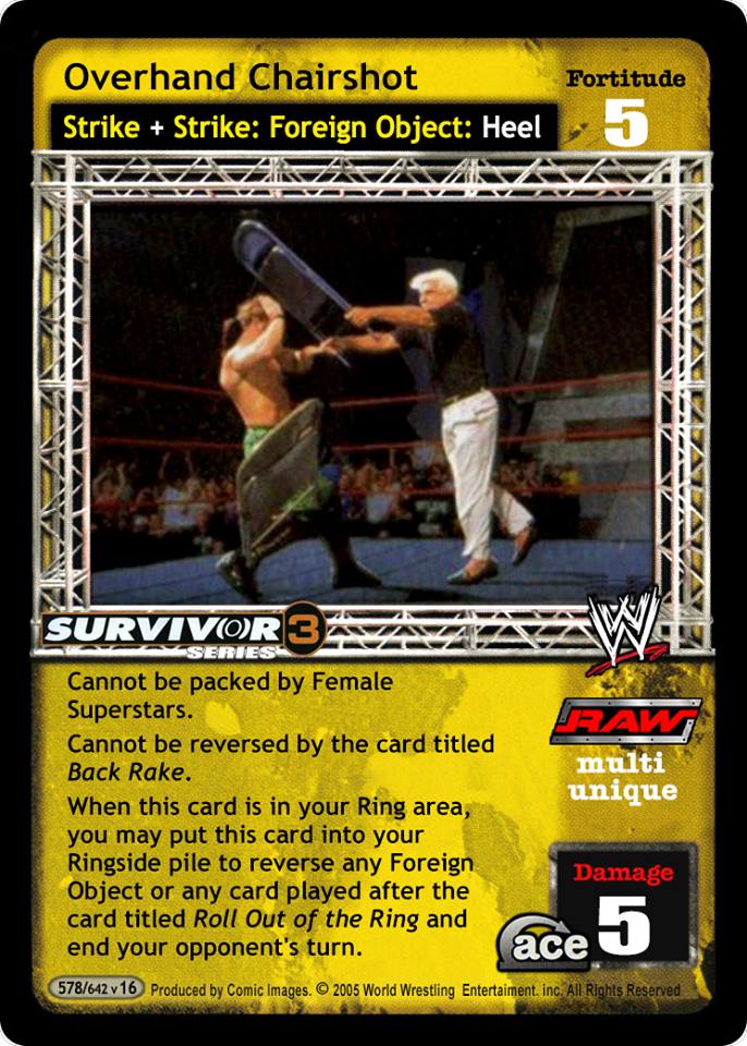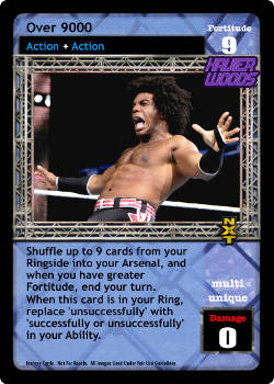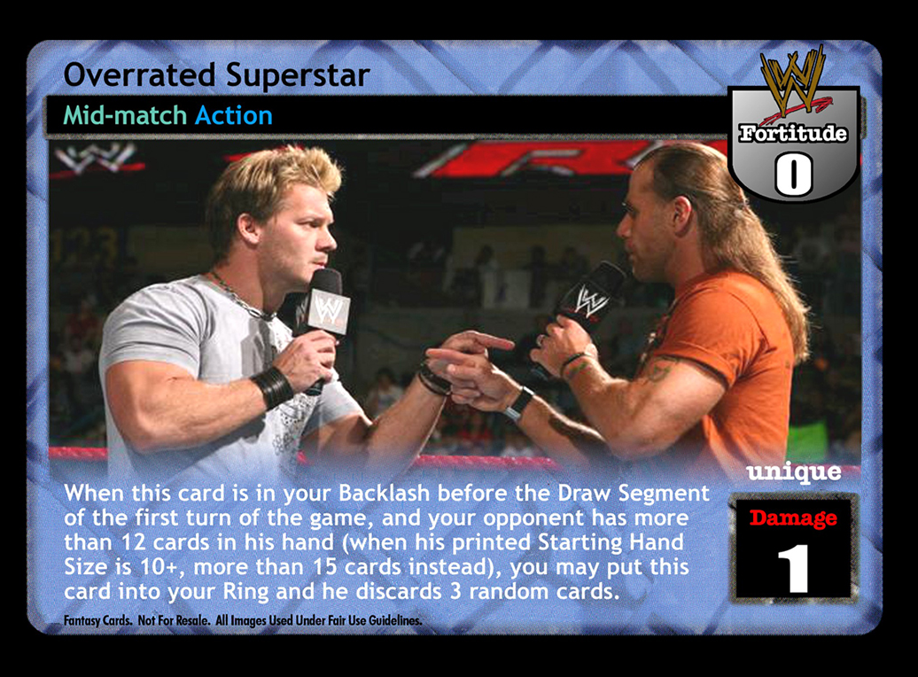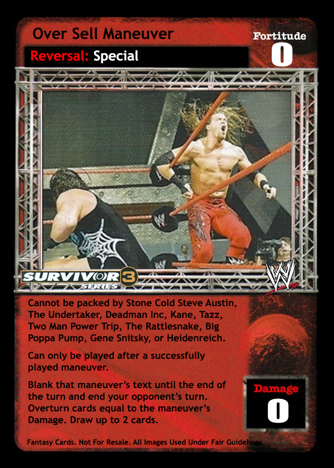 Cannot be packed by Stone Cold Steve Austin, The Undertaker, Deadman Inc, Kane, Tazz, Two Man Power Trip, The Rattlesnake, Big Poppa Pump, Gene Snitsky, or Heidenreich. Can only be played after a successfully played maneuver. Blank that maneuver's text until the end of the turn and end your opponent's turn. Overturn cards equal to the maneuver's Damage. Draw up to 2 cards.