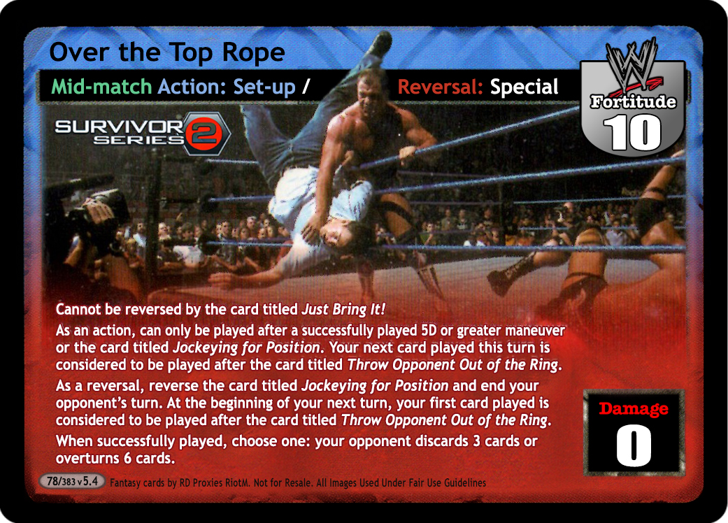 Cannot be reversed by the card titled Just Bring It! As an action, can only be played after a successfully played 5D or greater maneuver or the card titled Jockeying for Position. Your next card played this turn is considered to be played after the card titled Throw Opponent Out of the Ring. As a reversal, reverse the card titled Jockeying for Position and end your opponent's turn. At the beginning of your next turn, your first card played is considered to be played after the card titled Throw Opponent Out of the Ring. When successfully played, choose one: your opponent discards 3 cards or overturns 6 cards.