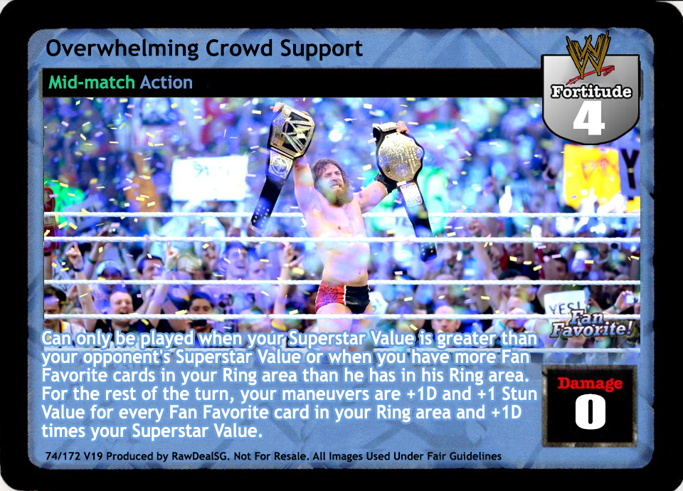 Can only be played when your Superstar Value is greater than your opponent's Superstar Value or when you have more Fan Favorite cards in your Ring area than he has in his Ring area. For the rest of the turn, your maneuvers are +1D and +1 Stun Value for every Fan Favorite card in your Ring area and +1D times your Superstar Value.