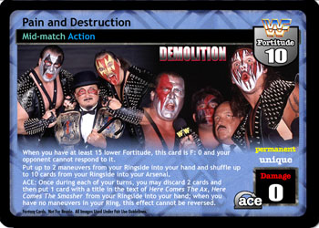 When you have at least 15 lower Fortitude, this card is F: 0 and your opponent cannot respond to it. Put up to 2 maneuvers from your Ringside into your hand and shuffle up to 10 cards from your Ringside into your Arsenal. ACE: Once during each of your turns, you may discard 2 cards and then put 1 card with a title in the text of Here Comes The Ax, Here Comes The Smasher from your Ringside into your hand; when you have no maneuvers in your Ring, this effect cannot be reversed.