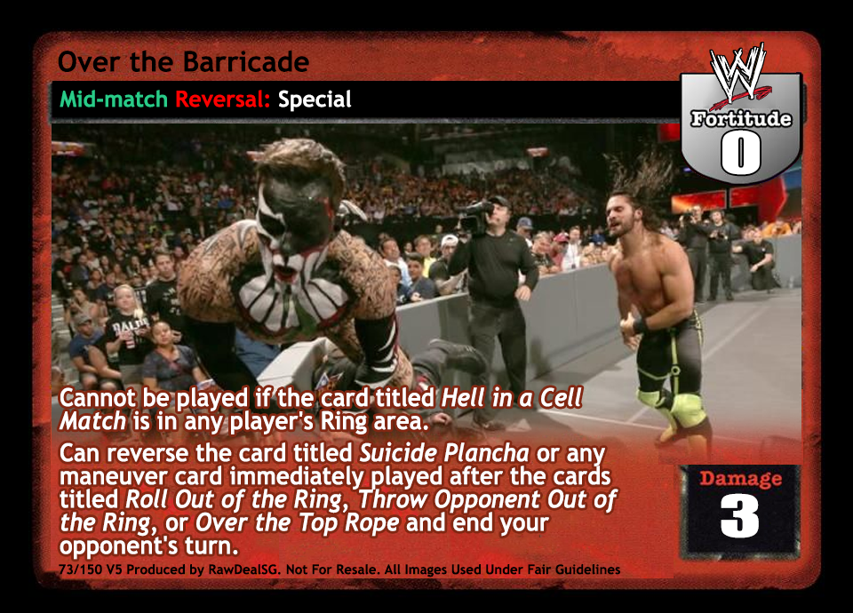 Cannot be played if the card titled Hell in a Cell Match is in any player's Ring area. Can reverse the card titled Suicide Plancha or any maneuver card immediately played after the cards titled Roll Out of the Ring, Throw Opponent Out of the Ring, or Over the Top Rope and end your opponent's turn.