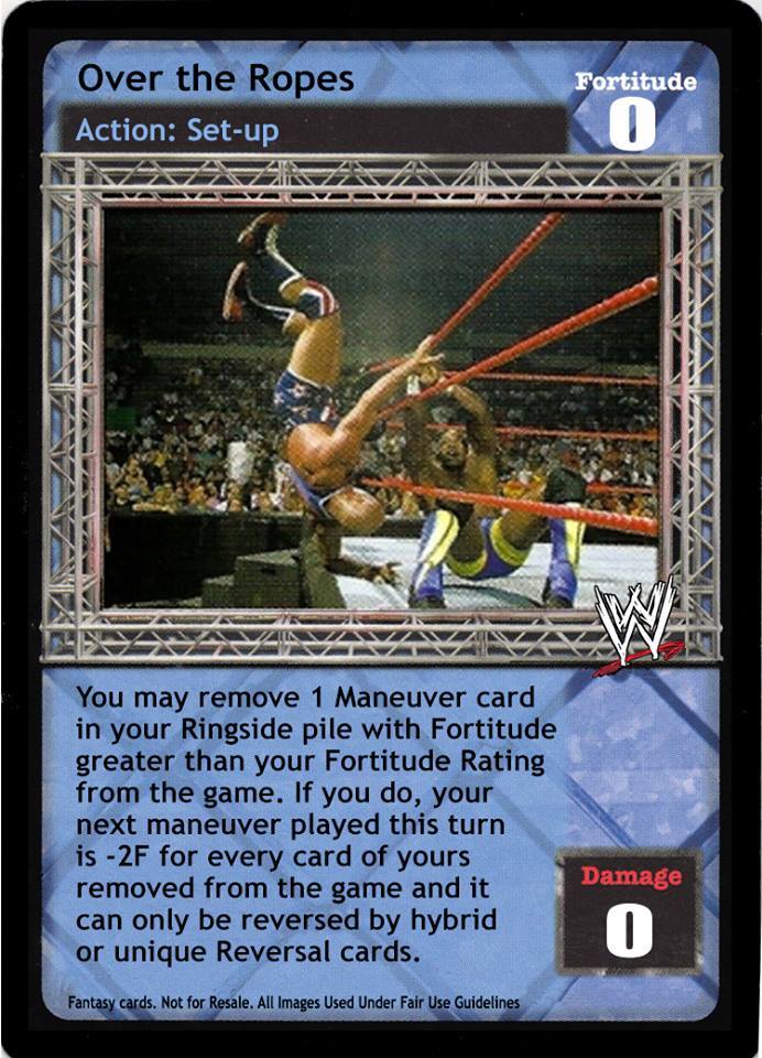 You may remove 1 Maneuver card in your Ringside pile with Fortitude greater than your Fortitude Rating from the game. If you do, your next maneuver played this turn is -2F for every card of yours removed from the game and it can only be reversed by hybrid or unique Reversal cards.