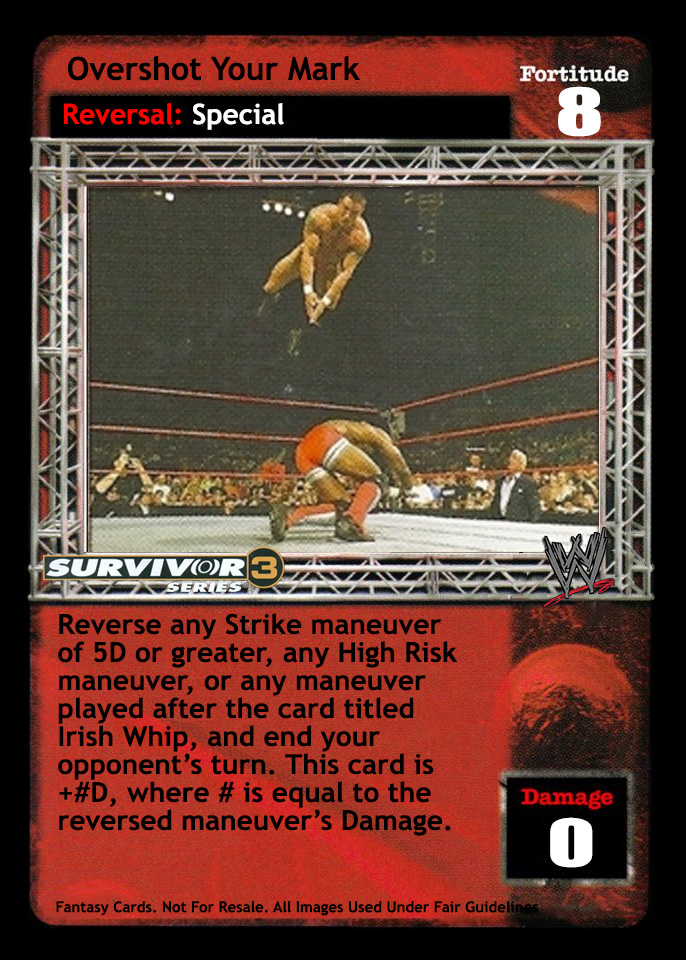 Reverse any Strike maneuver of 5D or greater, any High Risk maneuver, or any maneuver played after the card titled Irish Whip, and end your opponent's turn. # is equal to the reversed maneuver's Damage, read as 0 in your Ring area.
