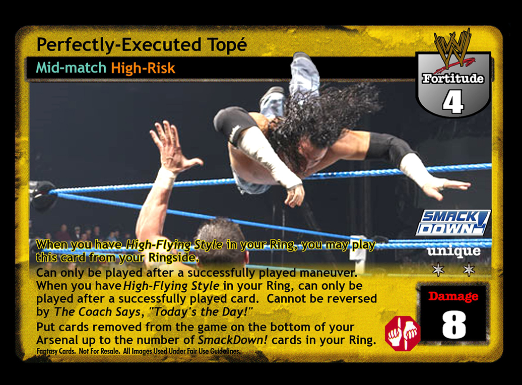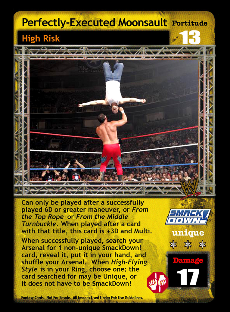 Can only be played after a successfully played 6D or greater maneuver, or From the Top Rope or From the Middle Turnbuckle. When played after a card with that title, this card is +3D and Multi. When successfully played, search your Arsenal for 1 non-unique SmackDown! card, reveal it, put it in your hand, and shuffle your Arsenal. When High-Flying Style is in your Ring, choose one: the card searched for may be Unique, or it does not have to be SmackDown!