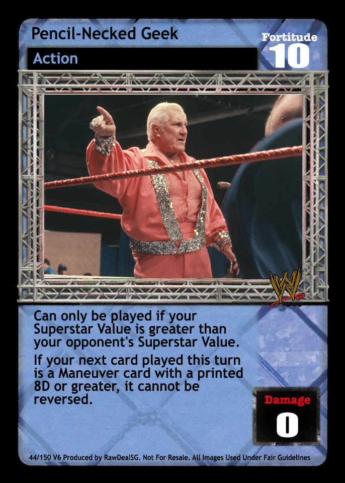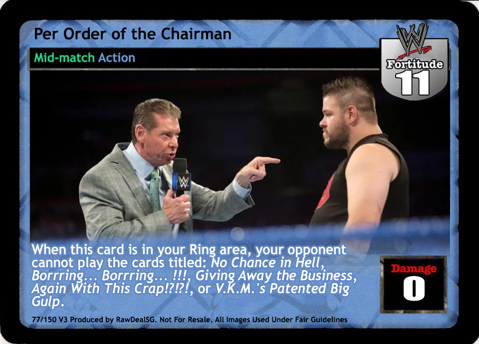 When this card is in your Ring area, your opponent cannot play the cards titled: No Chance in Hell, Borrring... Borrring... !!!, Giving Away the Business, Again With This Crap!?!?!, or V.K.M.'s Patented Big Gulp.