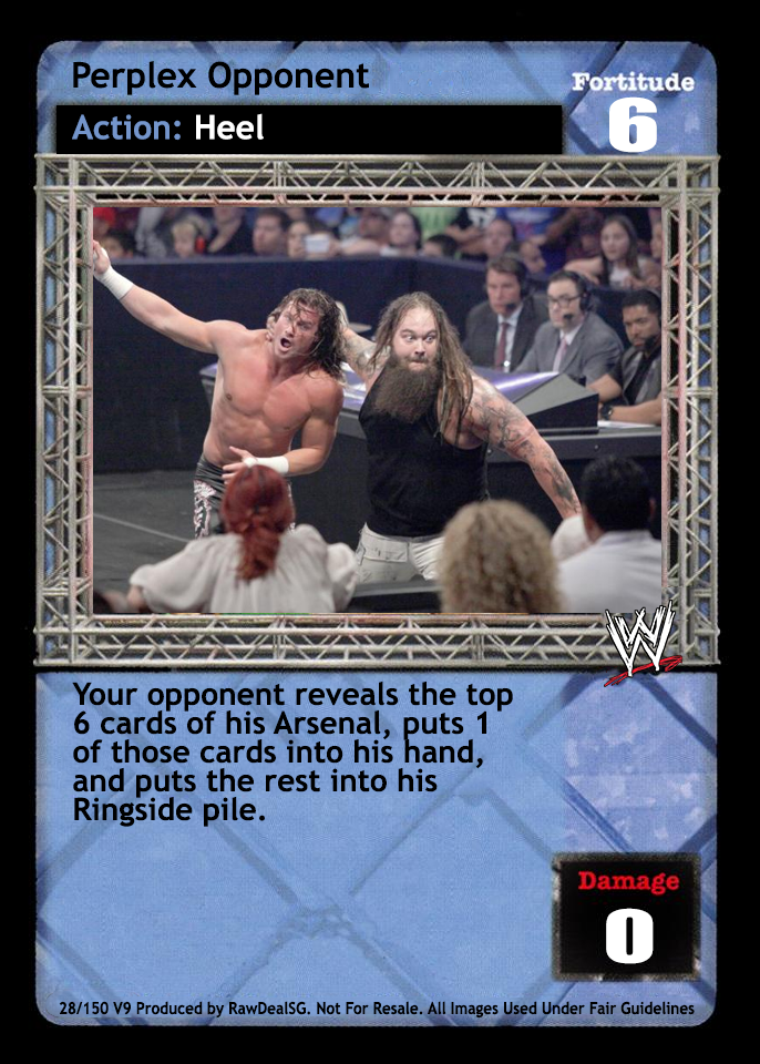 Your opponent reveals the top 6 cards of his Arsenal, puts 1 of those cards into his hand, and puts the rest into his Ringside pile.
