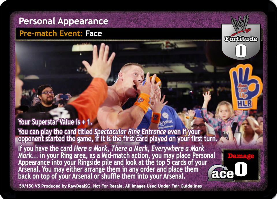 Your Superstar Value is + 1. You can play the card titled Spectacular Ring Entrance even if your opponent started the game, if it is the first card played on your first turn. If you have the card Here a Mark, There a Mark, Everywhere a Mark Mark... in your Ring area, as a Mid-match action, you may place Personal Appearance into your Ringside pile and look at the top 5 cards of your Arsenal. You may either arrange them in any order and place them back on top of your Arsenal or shuffle them into your Arsenal.