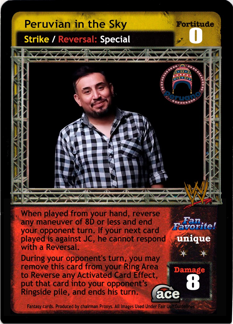 When played from your hand, reverse any maneuver of 8D or less and end your opponent turn. If your next card played is against JC, he cannot respond with a Reversal. During your opponent's turn, you may remove this card from your Ring Area to Reverse any Activated Card Effect, put that card into your opponent's Ringside pile, and ends his turn.