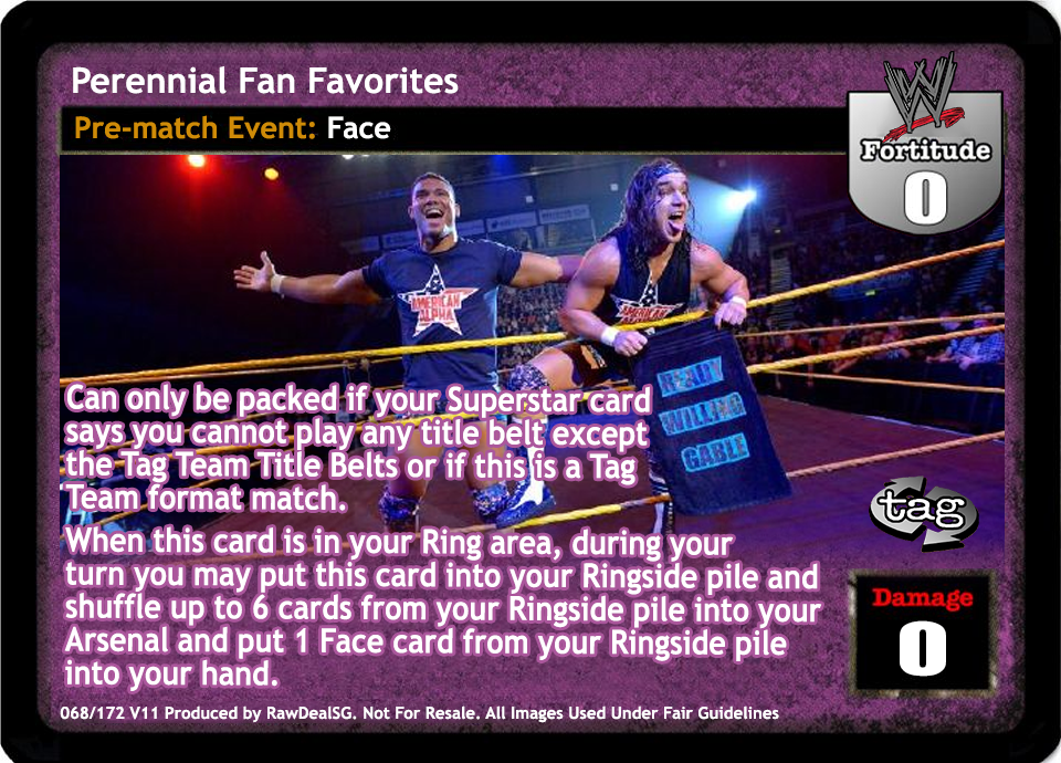 Can only be packed if your Superstar card says you cannot play any title belt except the Tag Team Title Belts or if this is a Tag Team format match. When this card is in your Ring area, during your turn you may put this card into your Ringside pile and shuffle up to 6 cards from your Ringside pile into your Arsenal and put 1 Face card from your Ringside pile into your hand.