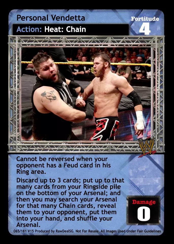 Cannot be reversed when your opponent has a Feud card in his Ring area. Discard up to 3 cards; put up to that many cards from your Ringside pile on the bottom of your Arsenal; and then you may search your Arsenal for that many Chain cards, reveal them to your opponent, put them into your hand, and shuffle your Arsenal.