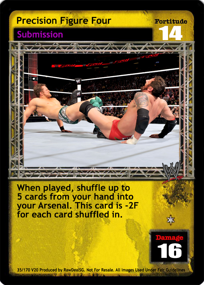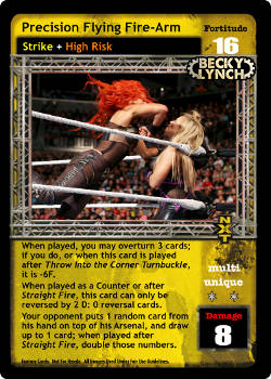 When played, you may overturn 3 cards; if you do, or when this card is played after Throw Into the Corner Turnbuckle, it is -6F. When played as a Counter or after Straight Fire, this card can only be reversed by 2 D: 0 reversal cards. Your opponent puts 1 random card from his hand on top of his Arsenal, and draw up to 1 card; when played after Straight Fire, double those numbers.