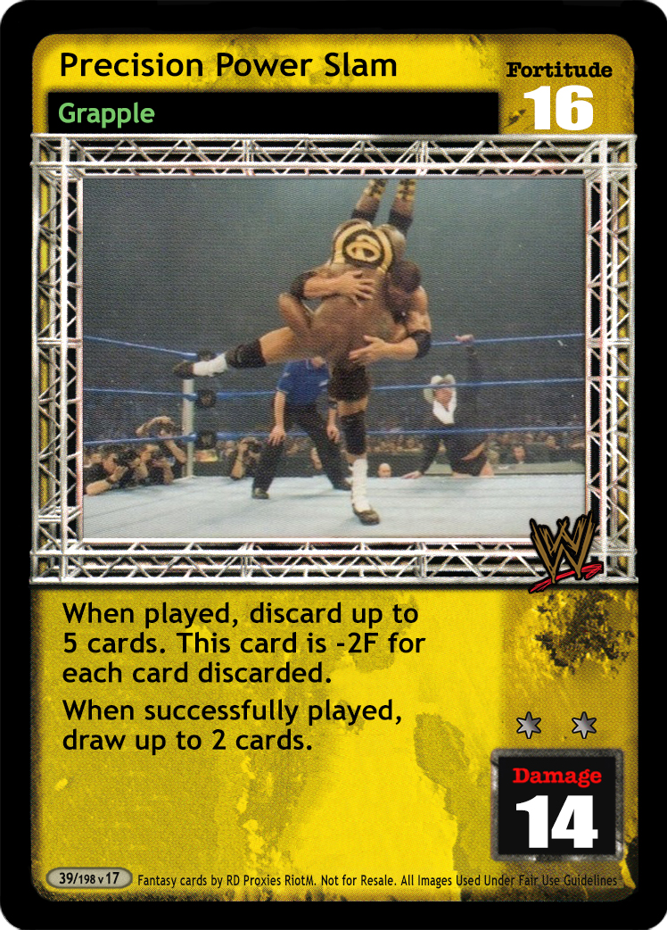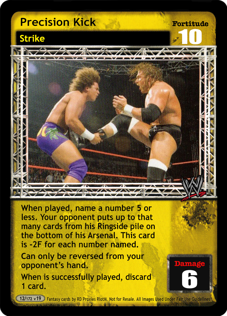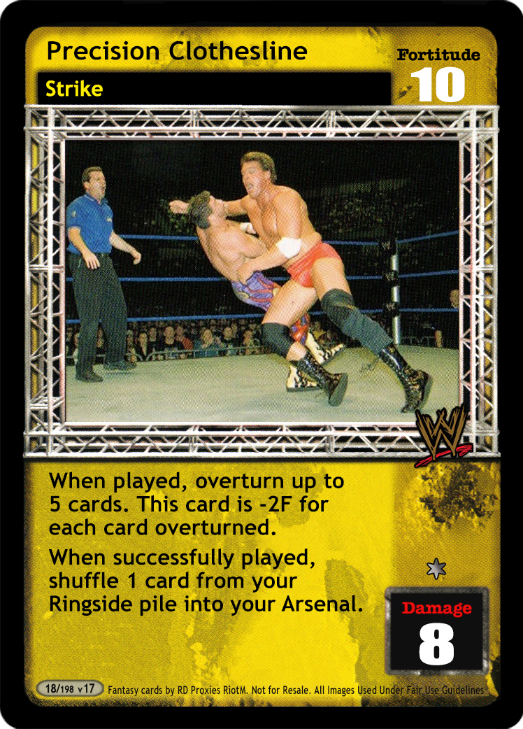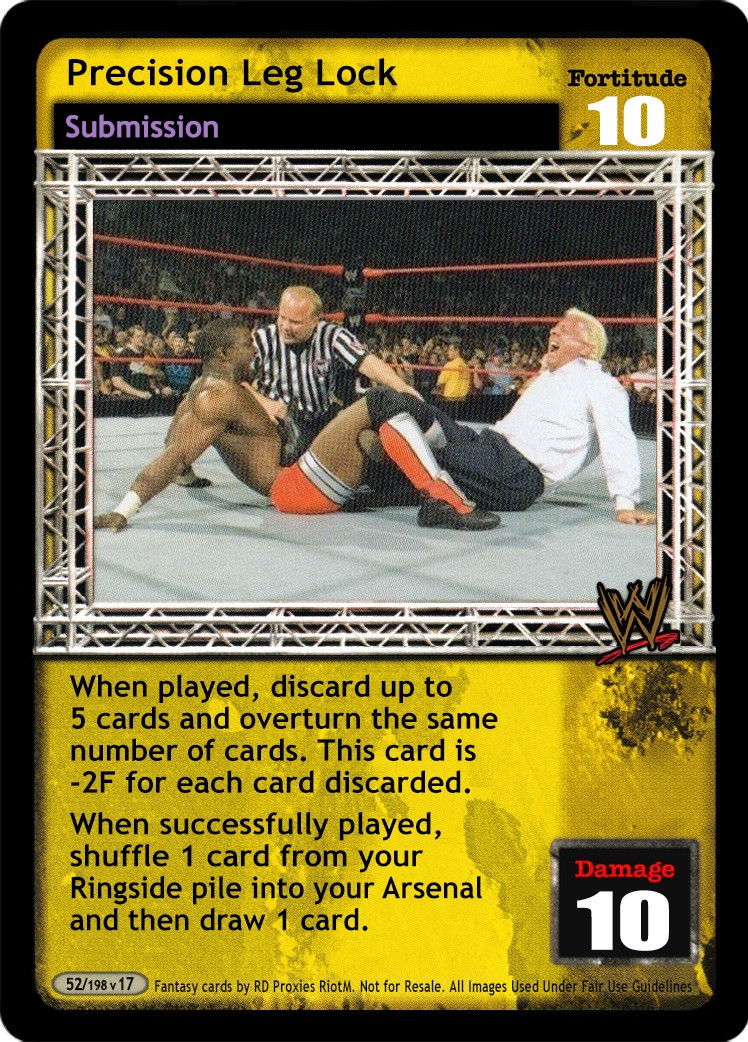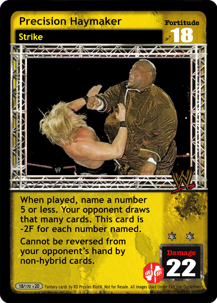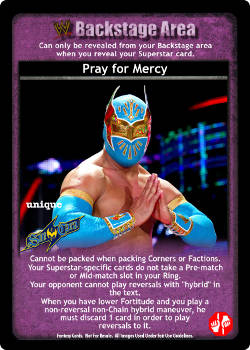 Cannot be packed when packing Corners or Factions. Your Superstar-specific cards do not take a Pre-match or Mid-match slot in your Ring. Your opponent cannot play reversals with 'hybrid' in the text. When you have lower Fortitude and you play a non-reversal non-Chain hybrid maneuver, he must discard 1 card in order to play reversals to it.