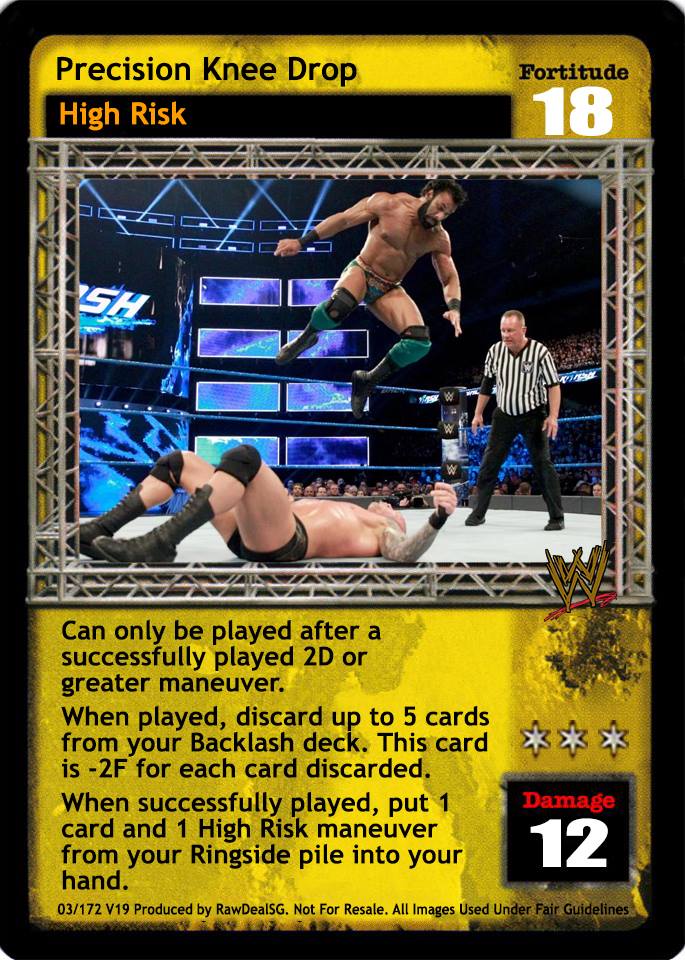 Can only be played after a successfully played 2D or greater maneuver. When played, discard up to 5 cards from your Backlash deck. This card is -2F for each card discarded. When successfully played, put 1 card and 1 High Risk maneuver from your Ringside pile into your hand.