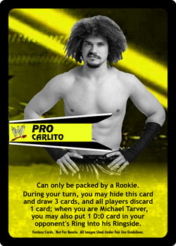 Can only be packed by a Rookie. During your turn, you may hide this card and draw 3 cards, and all players discard 1 card; when you are Michael Tarver, you may also put 1 D:0 card in your opponent's Ring into his Ringside.